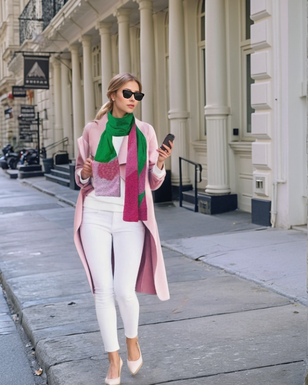 Made from 100% polyester, your scarf is machine washable and wrinkle-free, ensuring that it remains looking its best even after repeated use. The merrow edge finish adds a touch of sophistication, while the folded and sewn design conceals a plain base, creating an accessory for a polished and put-together appearance.