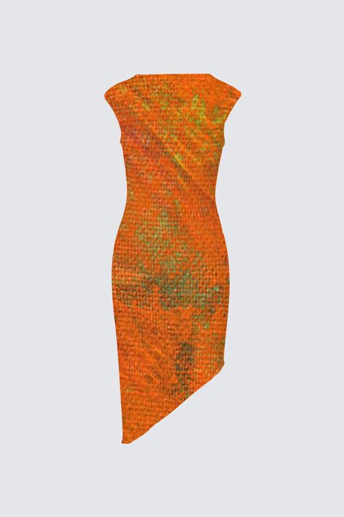Your F2 Dress is 41” in Length and the shorter side is 34" in length. Your dress is made from the Scuba Knit which is 95% Polyester and 5% Spandex. It is a stretch fabric with a smooth silky feel finish.